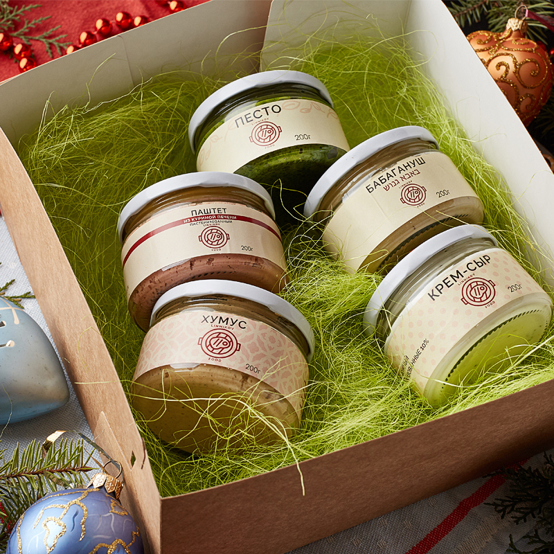 Паштет из куриной печени пастеризованный - 1 банка 200 гр Бабагануш - 1 банка 200 гр Хумус - 1 банка 200 гр Песто - 1 банка 200 гр Крем-сыр - 1 банка 200 гр