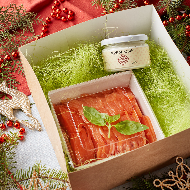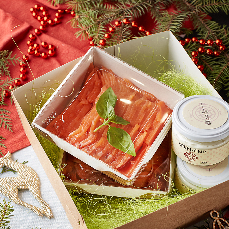 Подарочный набор из слабосолёной сёмги, пастрами из индейки, ветчины из индейки и двух баночек закусок песто и крем-сыра.