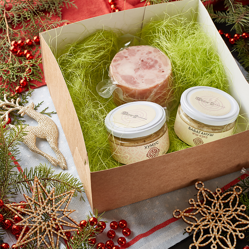 Подарочный набор из пастрами из индейки, ветчины из индейки и двух баночек закусок хумуса и бабагануш.